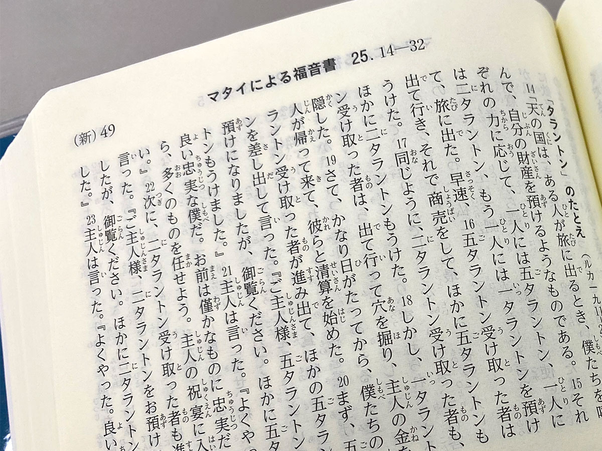 マタイによる福音書 第25章14-30節(『聖書 聖書協会共同訳』)に記されている「タラントン」のたとえ©日本聖書協会