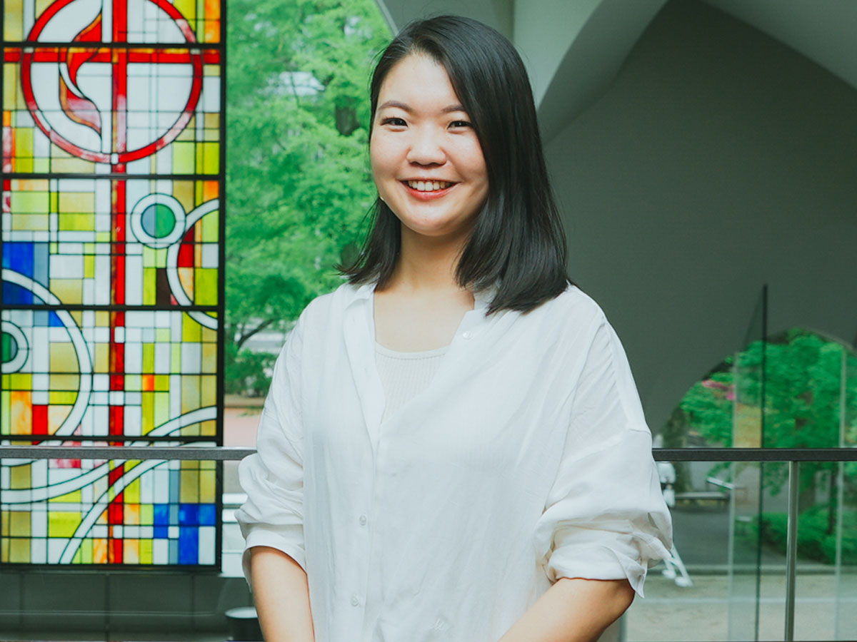 青山キャンパスで特に好きな場所はガウチャー記念礼拝堂です。礼拝堂は厳かな式典の場であると同時に「ゴスペル・クワイア」で活動している私にとっては日々の練習場所でもあり、さらにはコンサート会場として観客や神様に音楽を届ける場でもあります。そこにはいつも讃美歌やゴスペルの存在があり、私にとっては自然と心が落ち着く場所です。礼拝堂に響く歌声やメロディーは気持ちを整えて前向きにしてくれます。