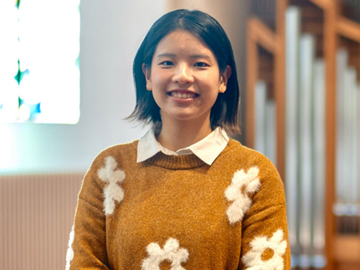 授業課題などで礼拝に出席する際には特別な準備や知識は必要ありません。礼拝堂では帽子を取り、私語は控える、スマートフォンはマナーモードにするといった基本的なマナーさえ意識すれば問題ないです。あとは静かに座って、讃美歌に耳を傾けたり軽く目を閉じたりして、それぞれの形で落ち着いた時間を過ごしてください。私自身も疲れを感じたときや心を落ち着かせたいときなどには、授業課題とは関係なく礼拝に出席しています。